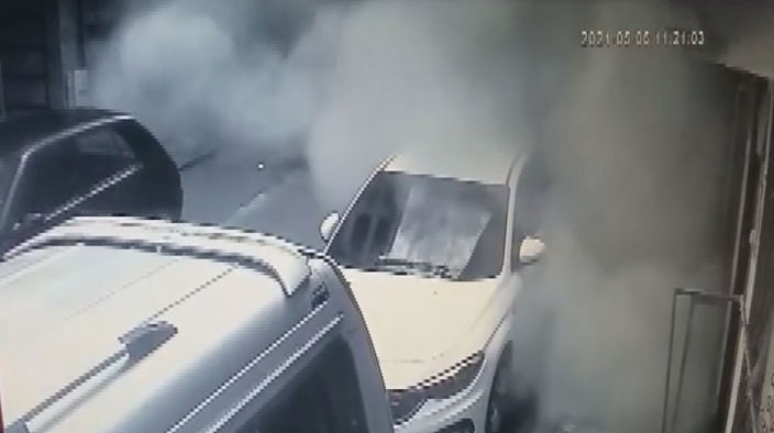 Görüntülerde yıkılma sırasında binanın önünde bulunan bir kedinin son anda kaçmaya başladığı, karşı kaldırımda bulunan bir kadının ise park halindeki kamyonun arkasına geçerek kafasını ellerinin arasına koyarak korku dolu bir şekilde beklediği görülüyor.