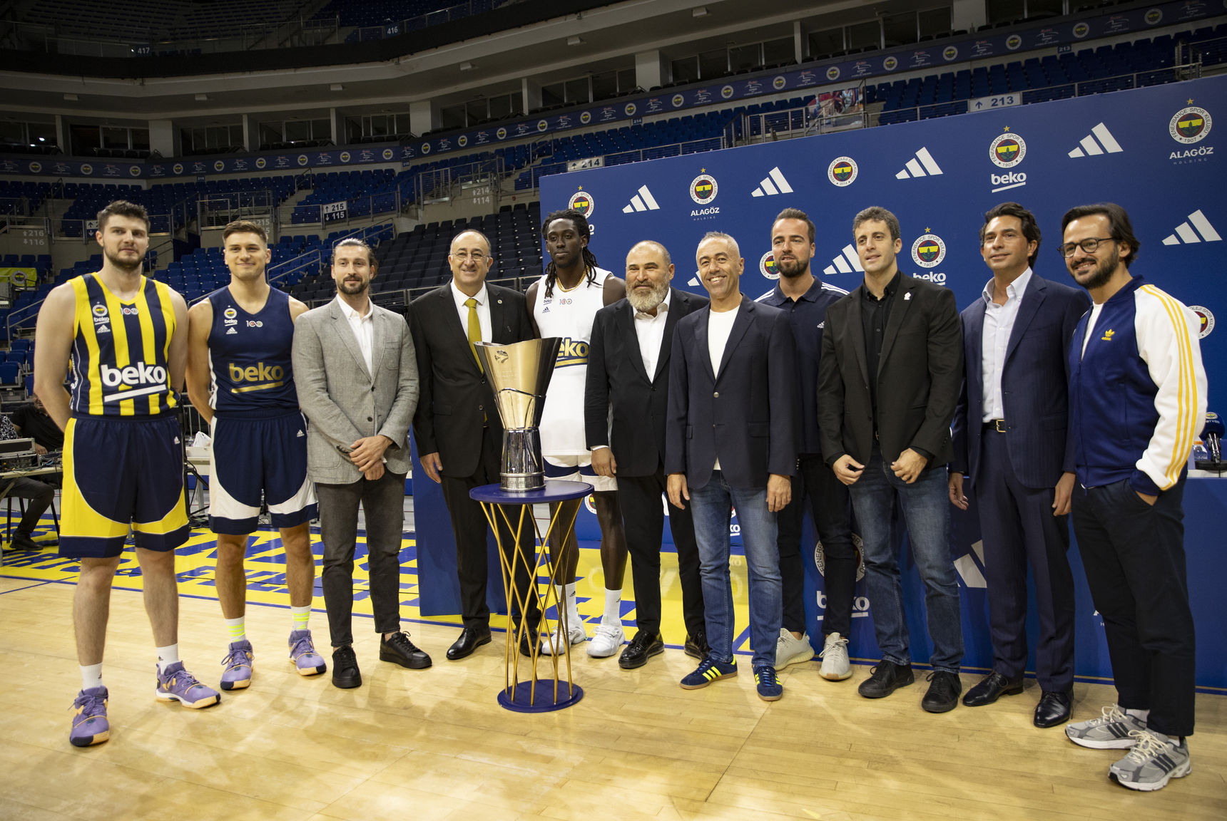 İmza töreninin ardından sarı-lacivertlilerin yöneticileri ile erkek ve kadın takımı oyuncuları, adidas formaları ve Avrupa Ligi kupalarıyla toplu fotoğraf çektirdi.