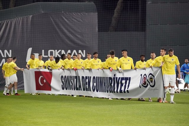 Sarı-lacivertli futbolcular da "Sonsuza dek Cumhuriyet" yazılı pankartla maç öncesinde ısınmak için sahaya geldi.