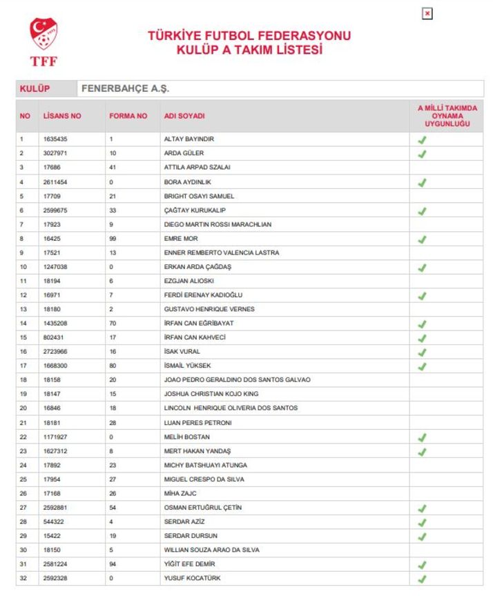 İşte Fenerbahçe'nin TFF'ye bildirdiği oyuncu listesi:
