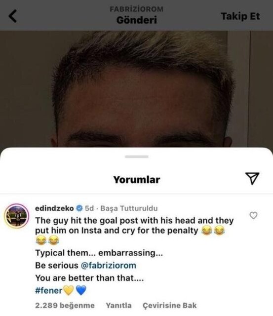 Dzeko yaptığı paylaşımda, "Adam kafasını direğe vurdu ve onu Instagram'a koyup penaltı için ağladılar. Onların tipik davranışı. Utanç verici. Her zamanki halleri. Fabrizio, sen de bundan daha iyisini yapabilirsin." ifadelerini kullandı.