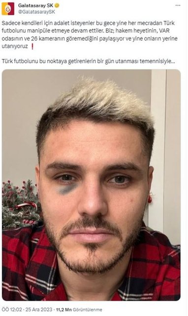 Icardi'nin moraran gözünün fotoğrafının yer aldığı paylaşımda ''Sadece kendileri için adalet isteyenler bu gece yine her mecradan Türk futbolunu manipüle etmeye devam ettiler. Biz; hakem heyetinin, VAR odasının ve 26 kameranın göremediğini paylaşıyor ve yine onların yerine utanıyoruz. Türk futbolunu bu noktaya getirenlerin bir gün utanması temennisiyle…'' ifadeleri kullanıldı.