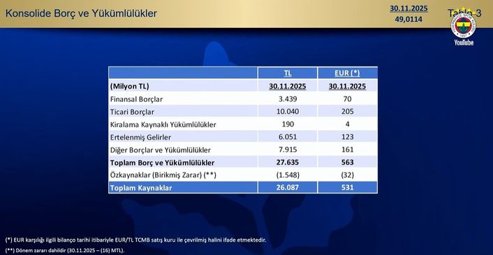 Fenerbahçe Kulübü'nün 30 Kasım 2025 itibarıyla toplam borcunun 27 milyar 635 milyon TL olduğu açıklandı.