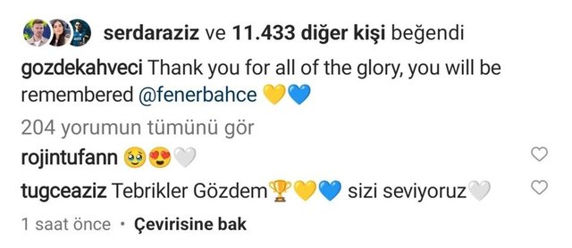 İlk olarak Gözde Kahveci, Türkiye Kupası zaferinin ardından seremoniden görüntüler paylaşıp, "Tüm zaferler için teşekkürler, hatırlanacaksın Fenerbahçe" ifadelerini kullandı.