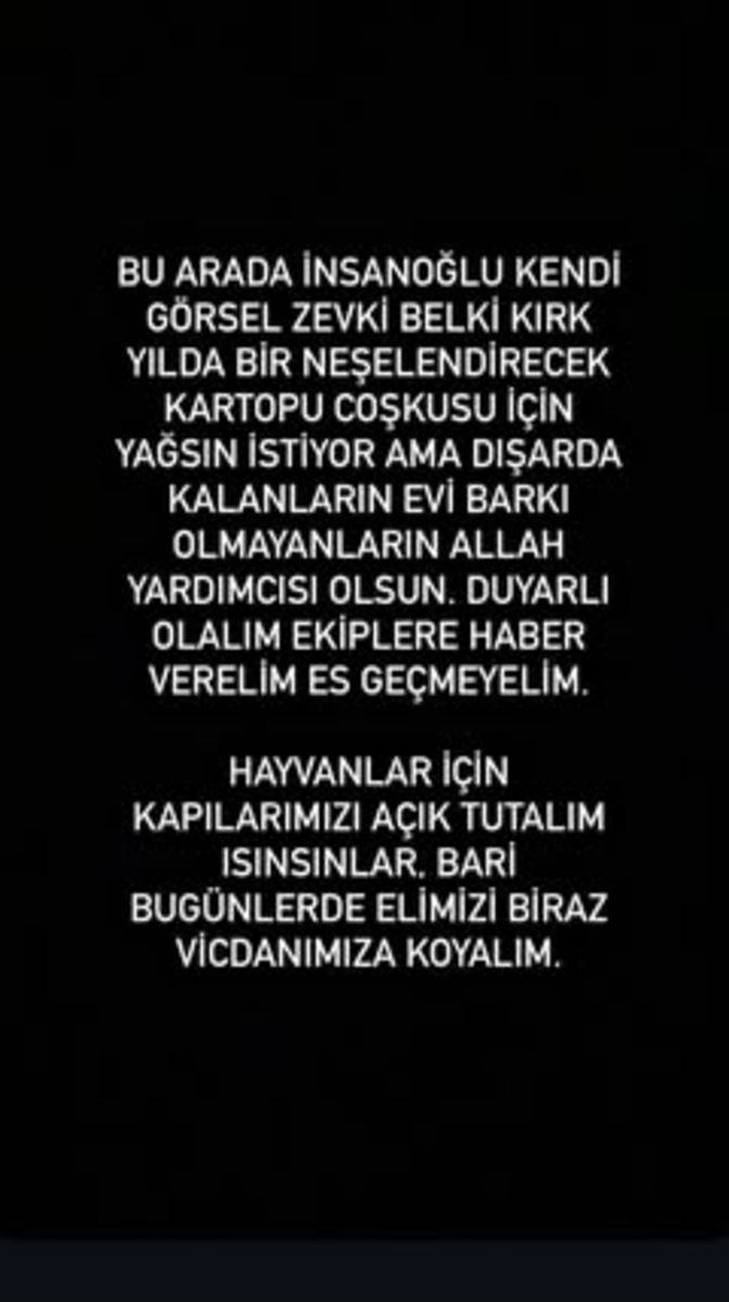 Feyyaz Şerifoğlu, paylaşımında şu ifadelere yer verdi: Bu arada insanoğlu kendi görsel zevki belki kırk yılda bir neşelendirecek kartopu coşkusu için yağsın istiyor ama dışarıda kalanların, evi barkı olmayanların Allah, yardımcısı olsun. Duyarlı olalım, ekiplere haber verelim, es geçmeyelim. Hayvanlar için kapılarımızı açık tutalım. Isınsınlar... Bari bugünlerde elimizi biraz vicdanımıza koyalım.