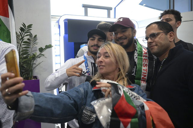 Delegasyonu karşılamaya gelen destekçiler, omuzlarına ve boyunlarına Filistin kefiyesi takarken, bazıları da "İsrail işgalini boykot et" ve "Filistin özgür olmadıkça kimse özgür değil" yazılı tişörtler giydi.