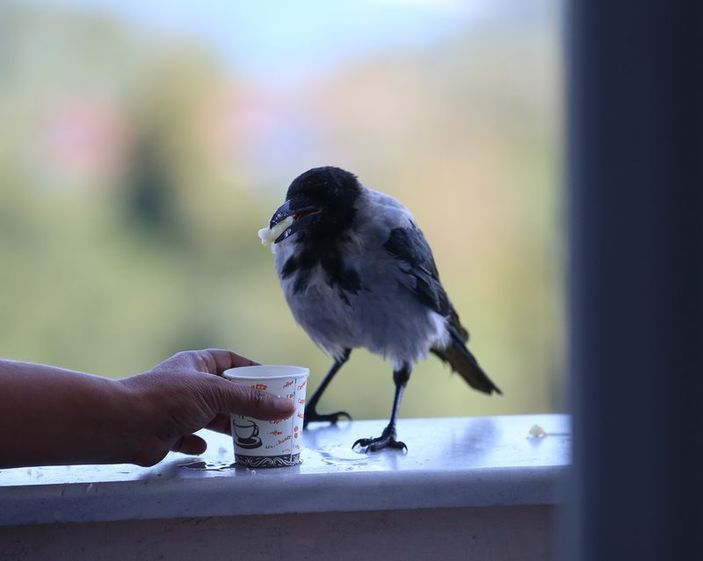 Her gün balkonuna gelen kargaya su ve yiyecek verdiğini ifade eden Demirbaş, şöyle devam etti: