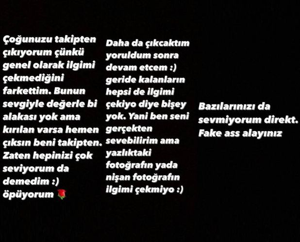 Daha çok çıkacaktım yoruldum. Sonra devam edeceğim. Geride kalanların hepsi de ilgimi çekiyor diye bir şey yok. Yani ben seni gerçekten sevebilirim ama yazlıktaki fotoğrafın ya da nişan fotoğrafın ilgilimi çekmiyor. Bazılarınızı da sevmiyorum. Alayınız sahte!