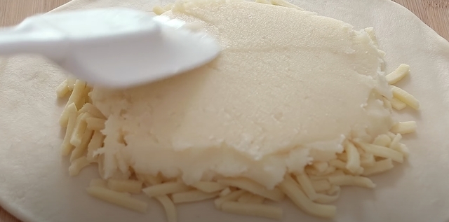 Açtığınız hamurun üzerine rendelediğiniz kaşarın yarısını koyun. Daha sonra üzerine tüm patatesi sürün.