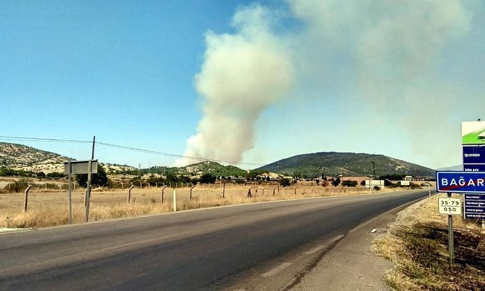 Foça'nın kırsal Ilıpınar ile Kozbeyli mahalleleri arasındaki Gölyüzü mevkisinde cüruf depolama sahası yakınındaki ormanlık alanda, saat 15.00 sıralarında yangın çıktı.