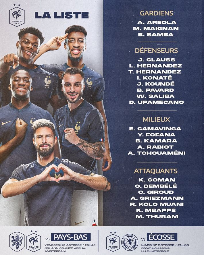 Fransa Milli Takım Teknik Direktörü Didier Deschamps, 13 Ekim'de Hollanda ile oynayacakları EURO 2024 eleme grubu maçı ile 17 Ekim'de İskoçya ile karşılaşacakları hazırlık maçının aday kadrosunu açıkladı.