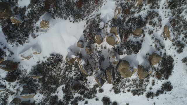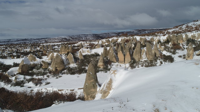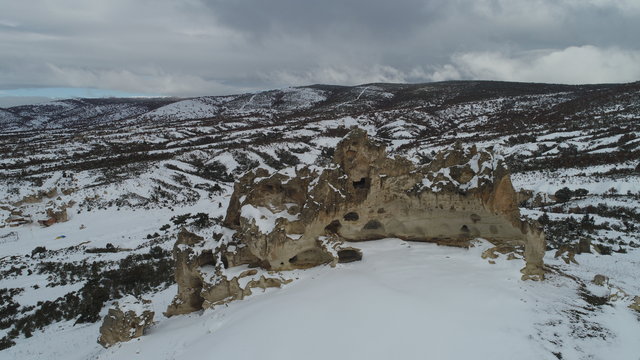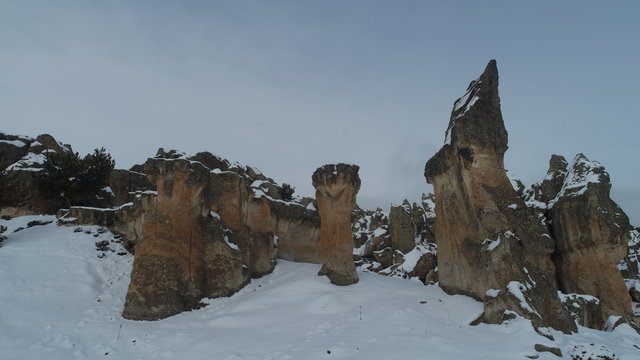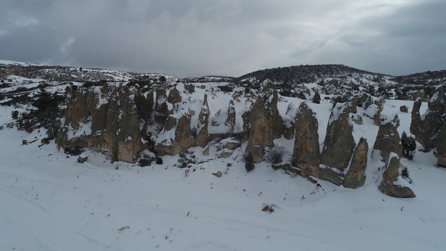 Frig Vadisi'nde son günlerde etkili olan kar yağışı, oyma kaya mezarları, peribacaları ve Emre Gölü'nde görsel şölen oluşturdu