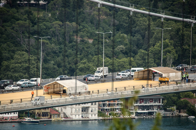 Fatih Sultan Mehmet Köprüsü'nde asfalt yenileme çalışmalarında bir hafta doldu. 24 saat aralıksız çalışılan köprüde mevcut asfalt kazındıktan sonra, ortaya çıkan metal kumlanarak pastan arındırılıyor, ardından iki ayrı izolasyon malzemesiyle boyanıyor. Bu çalışmaların ardından köprünün üstü özel bir asfaltla kaplanacak.