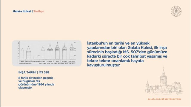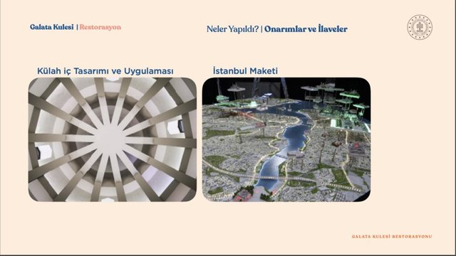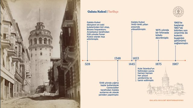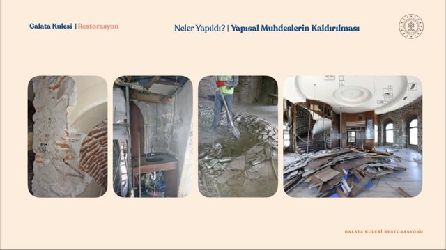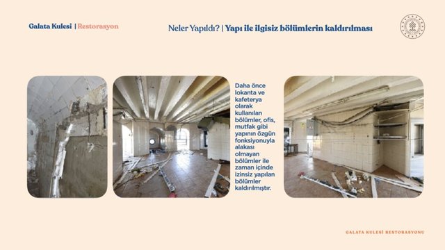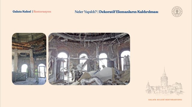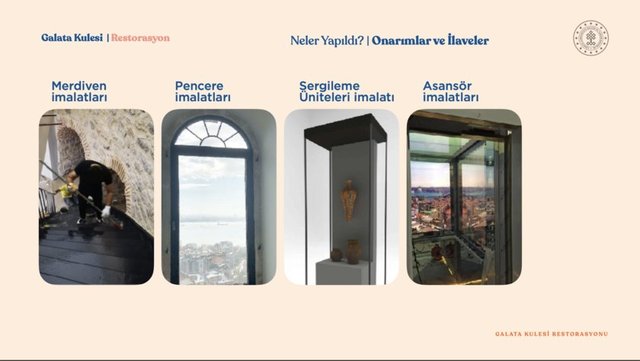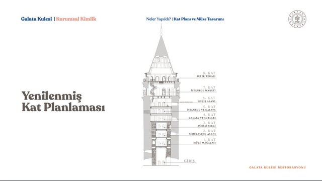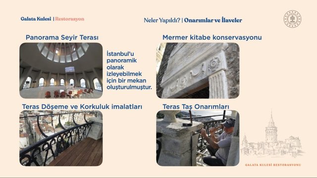 Galata Kulesi'nin restorasyonu 100 gün içinde tamamlandı. Kültür ve Turizm Bakanı Mehmet Ersoy, restorasyonda kulenin içinden bin ton betonu söküp tam bin kamyonet dolusu ağırlığı da çıkardıklarını aktardı. Ersoy, depremden ziyade kule için en büyük tehlikenin yangın olduğunu belirtirken bu anlamda binanın elektrik sisteminin baştan aşağı yenilendiğini belirtti. Restorasyon sonrasında artık Galata'da bir restoran olmayacak. Yani kulenin içinde yeme içmeye dair hiç bir hizmet verilmeyecek. Kule sadece turistik gezi için ziyaretçilerine kapılarını açacak. Merak edenler için en çarpıcı değişiklikler ise 8'inci kattaki seyir terasında...