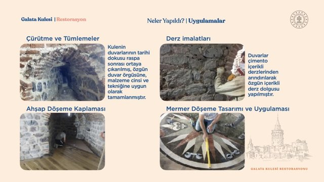 Soldaki fotoğraf kule kulahının yeni hali sağdaki ise eski görünümü.Katlar arasındaki beton merdivenler yerine metal aksamlarla eski görünüm farklılaştırıldı. Taş duvarların kuvvetlendirilmesi için de organik bir malzeme olan ‘Horasan Sıva Harcı’ kullanıldı. Taş derzinde kullanılan bu sıva türü çimentonun aksine binanın hava almasını ve taşların çürümesini engelliyor. Zira farklı organik malzemelerin kireç ile karışması ile ortaya çıkarılıyor. Galata Kulesi artık her katı baştan aşağı yenilenmiş olarak turistik ziyaretçilerini bekliyor.
