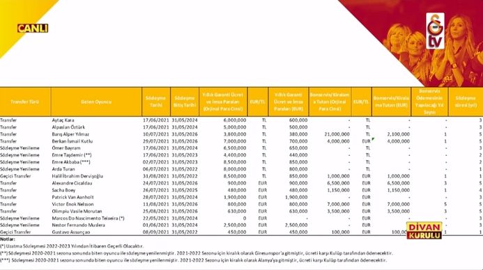 Elmas, sarı-kırmızılı ekibin bu sezon gerçekleştirdiği transferlerin mali detaylarını paylaştı. Önemli bir transfer sezonunu geride bıraktıklarını söyleyen Elmas, "Galatasaray’ın bir senelik yönetimin takdiri için herkesi mutlu edecek transferleri yapma lüksü yok. Burada cesaret göstererek, ince eletip sık dokuyarak, bir dönemlik değil, 4 senelik bir sistem uygulamak gerekiyordu. Biz ve teknik direktörümüz bir anlaşmayla büyük bir cesaret gösterdik. Belki de Galatasaray’da ilk defa gerçekleştirişmiş bir strateji ile transfer dönemini geçirdik. Çok eleştiriler geldi. Diğer rakiplerimiz hiçbir detay paylaşmıyor. Biz finansal disiplinden ödün vermeyeceğiz" diye konuştu.