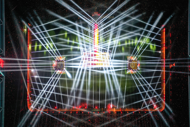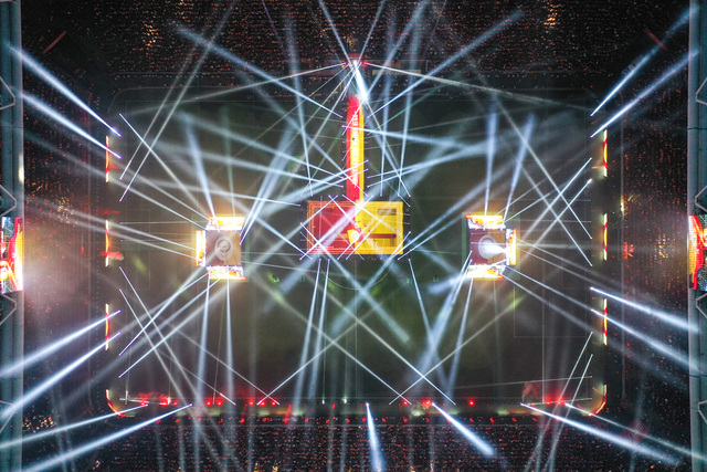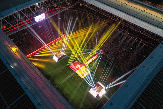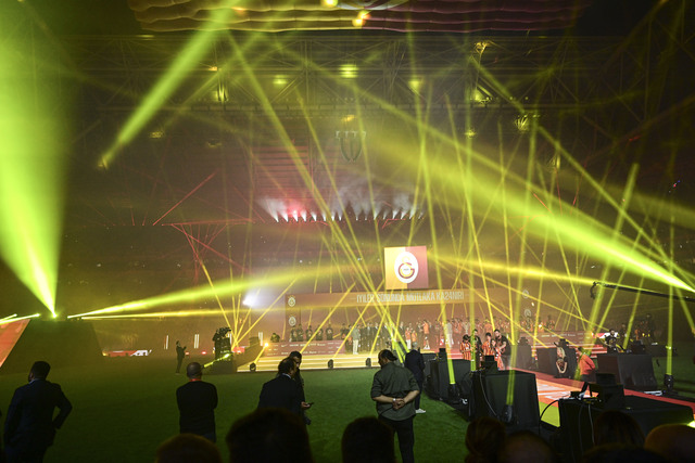 Stat içinde kurulan dev sahne etrafında beğeni toplayan bir ışık şovuna da imza atıldı. Erkek futbol takımının kazandığı kupaların törenine geçildiği sırada devreye dronlar girdi.