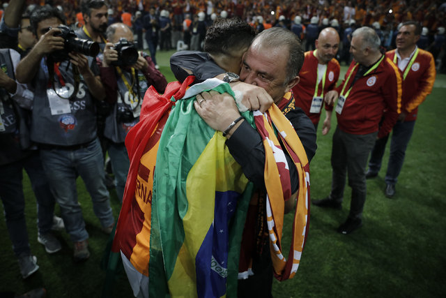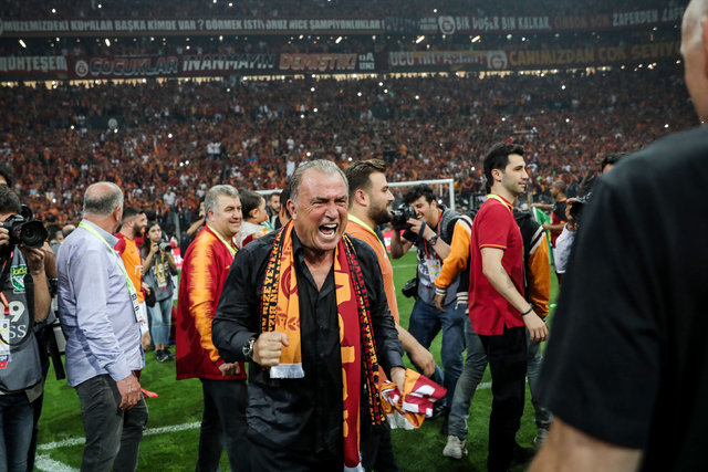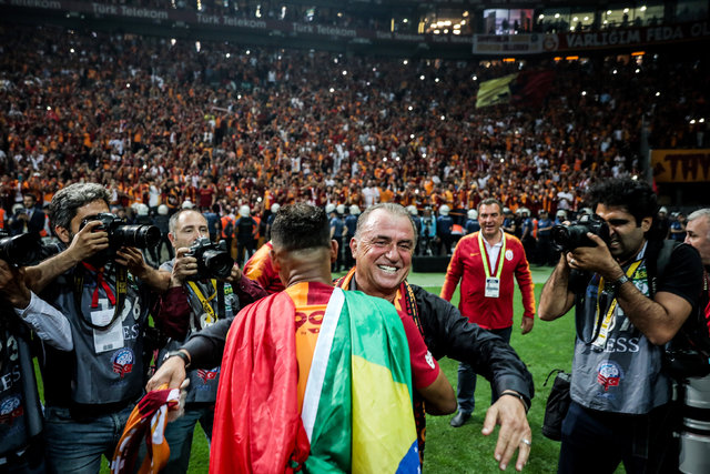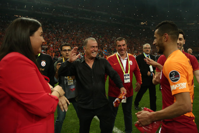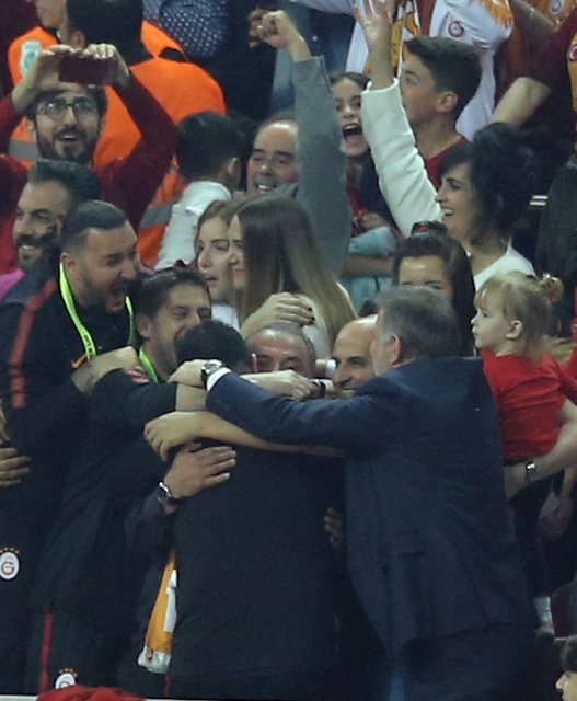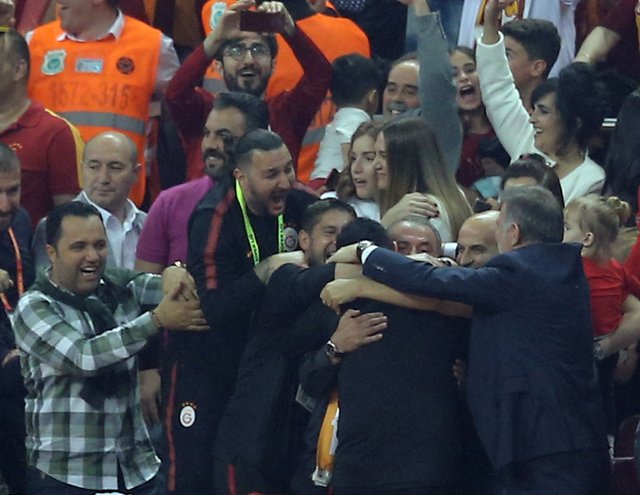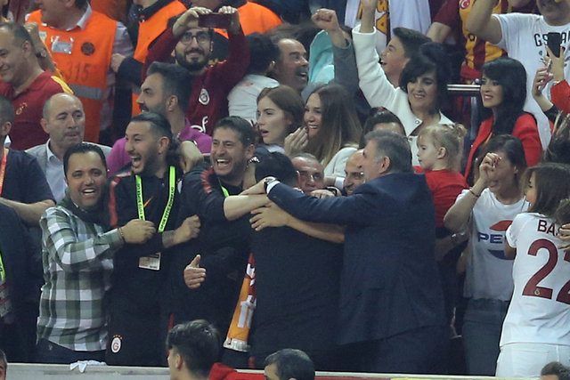 Teknik direktör Fatih Terim, saha içinde oyuncularını tek tek kutladı. Sarı-kırmızılı çalıştırıcının, Onyekuru ile uzun süre kucaklaşması dikkati çekti. Terim, daha sonra tribünleri gezip, taraftarları selamladı. Tecrübeli teknik adamın mutluluğuna kızı Merve Terim Çetin de ortak oldu.