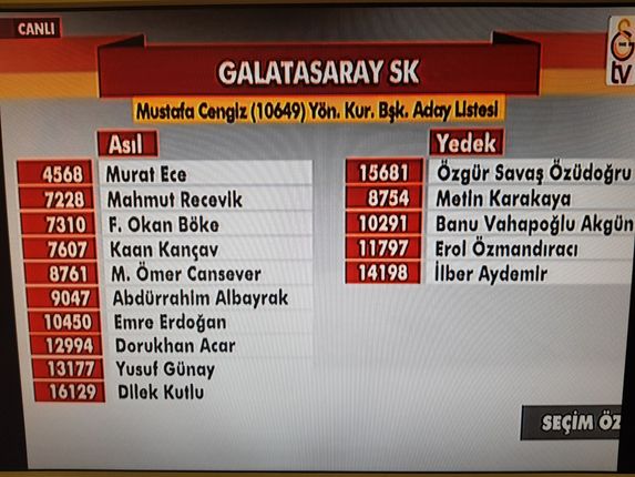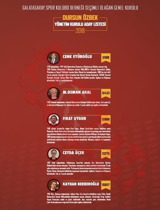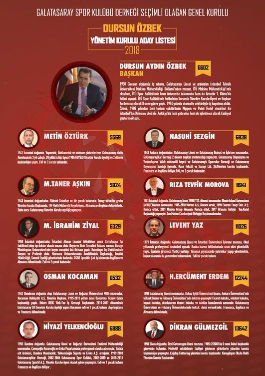 Mustafa Cengiz tarafından Sportif AŞ'de görev alan Abdürrahim Albayrak, Cengiz'in yönetim kurulu listesinde yer alırken Burak Elmas, Ozan Korkut'un listesine girdi. Yıllardır başkanlık için adı geçen Adnan Öztürk Korkut'un listesinde yer aldı. Galatasaray'da yöneticilik yapan Mete İkiz ile eski başkanlardan Mehmet Cansun'un oğlu Naci Cansun da Ozan Korkut'un ekibine dahil oldu.