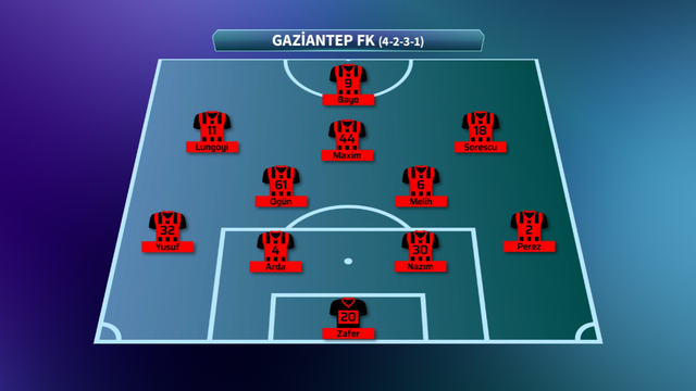 GAZİANTEP FK: Zafer, Perez, Nazım, Arda, Yusuf, Ogün, Melih, Maxim, Sorescu, Lungoyi, Bayo
