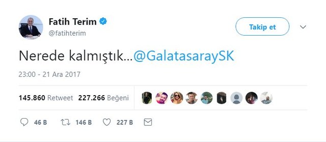 21 Aralık Perşembe gecesi tam 23.00'te Fatih Terim'in "Nerede kalmıştık" tweeti taraftarı çılgına çevirdi. Saray'da 4. Terim imparatorluğu başlıyordu... Terim'in ilk sözleri ise "Ben Galatasaray'la para konuşmam" oldu.