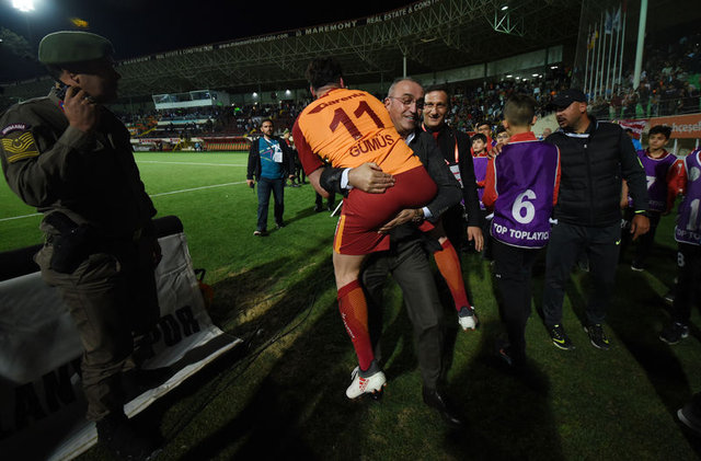 Beşiktaş maçının ardından Akhisar’da da penaltı kaçırması nedeniyle yıkım yaşayan Gomis, galibiyete rağmen hüngür hüngür ağlamıştı. Sinan Gümüş maçtan sonra üzerinde ultrAslan yazan dev bayrağı Gomis’e getirdi. Fransız futbolcu bir süre bayrak salladı, sonra saha ortasına gelerek üçlü çektirdi.
