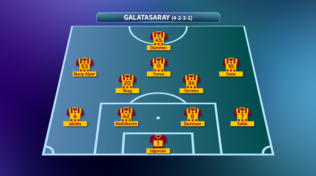 GALATASARAY: Uğurcan, Sallai, Sanchez, Abdülkerim, Jakobs, Torreira, İlkay, Yunus, Sane, Barış, Osimhen