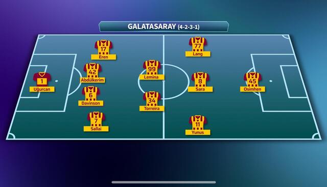 Galatasaray: Uğurcan, Eren, Abdülkerim, Davinson, Sallai, Torreira, Lemina, Lang, Sara, Yunus, Osimhen