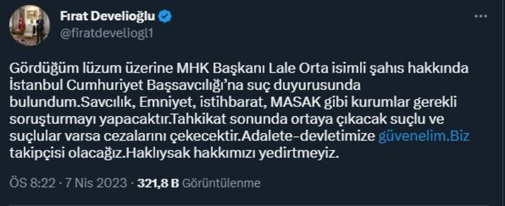 Fırat Develioğlu'nun avukatı Eser Çömlekçioğlu ise suç duyurusu ile ilgili şu açıklamayı yaptı: