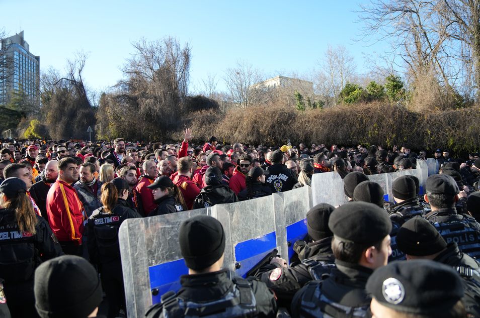 Trendyol Süper Lig'in 25. haftasındaki Beşiktaş-Galatasaray derbisi öncesi sarı-kırmızılı taraftarlar, maçın oynanacağı Tüpraş Stadı'na ulaştı.
