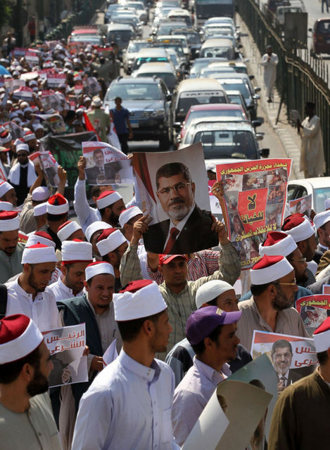 Mısır'ın başkenti Kahire'deki El-Ezher Üniversitesinden Ezher Genel Merkezi'ne kadar yürüyen alim ve din adamları, ülkenin seçilmiş ilk Cumhurbaşkanı Muhammed Mursi'nin askeri darbe ile görevden uzaklaştırılmasını protesto etti.
