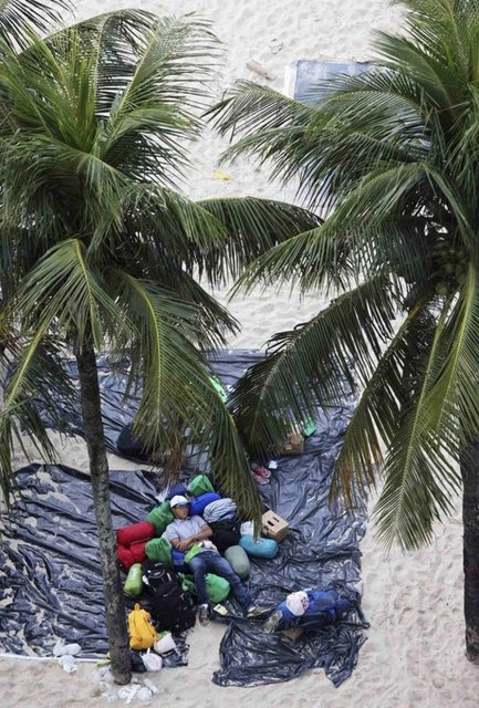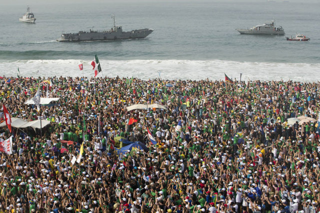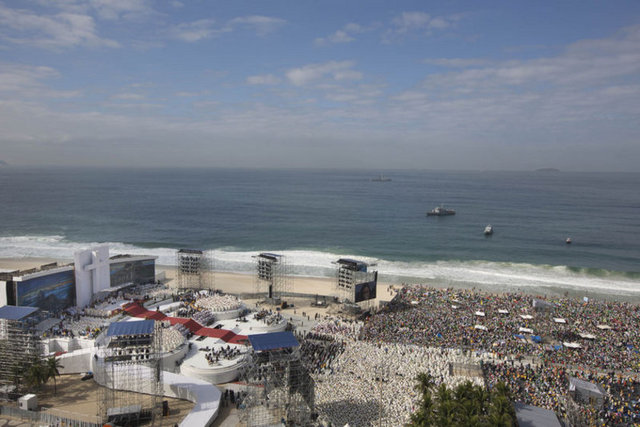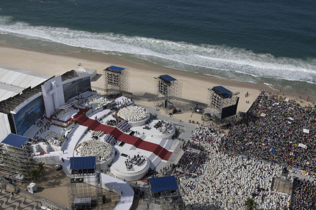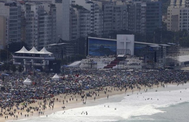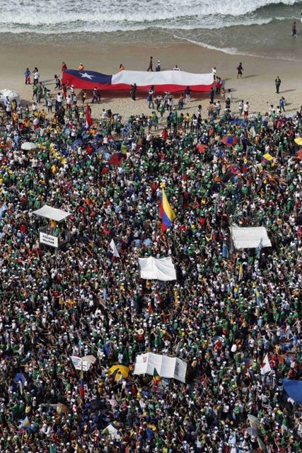 4 kilometrelik Copacabana plajının her tarafında, Papa'nın ayinine gelenlerin üzerlerine sardıkları bayraklar ve soğuktan korunmak amacıyla büründükleri uyku tulumlarıyla adeta bir festival havası yaşandı.