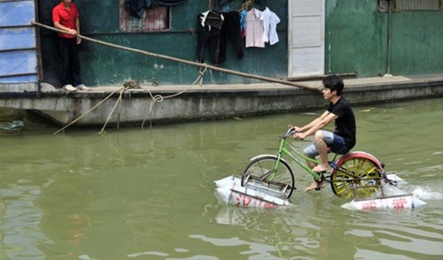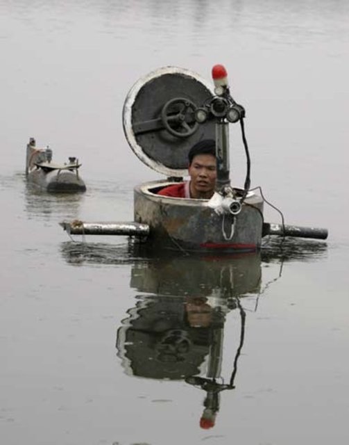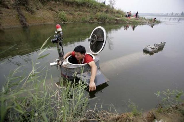 Zhang Wuyi adlı bu arkadaş bir denizaltı yapmakla kalmamış ona bağladığı pipetlerle deniz hıyarlarını da toplamış.