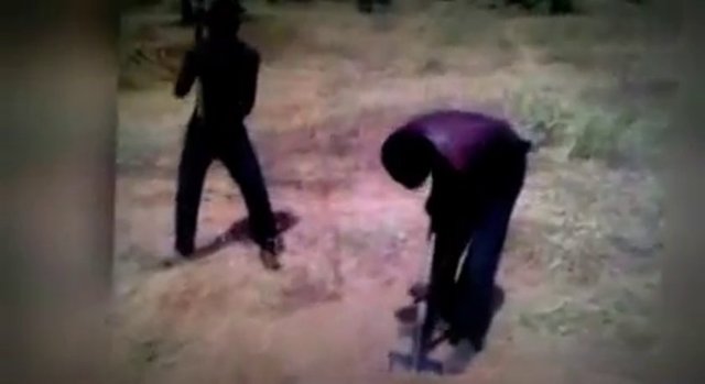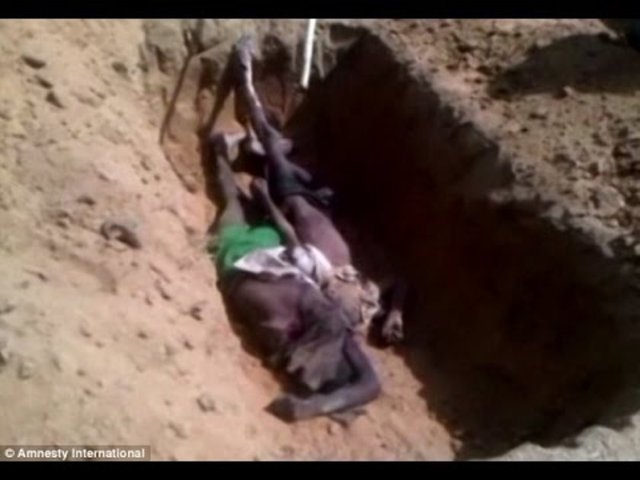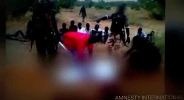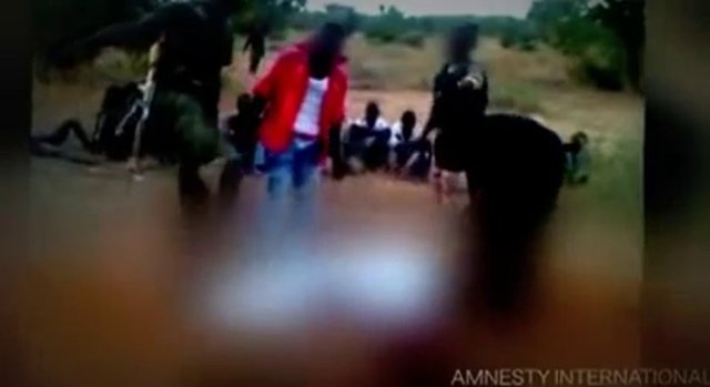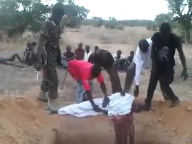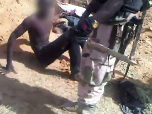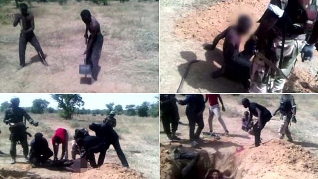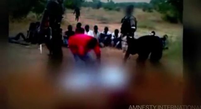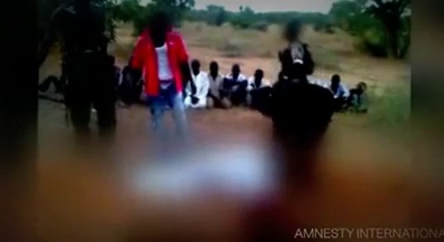 Af Örgütü tarafından yayınlanan görüntülere göre, Nijeryalı askerler Borno eyaletinde ele geçirdikleri iki Boko Haram militanına kazma ve kürekle kendi mezarlarını kazdırdıktan sonra, savaş bıçağıyla militanların boğazlarını kesip çukurun içine attılar.
