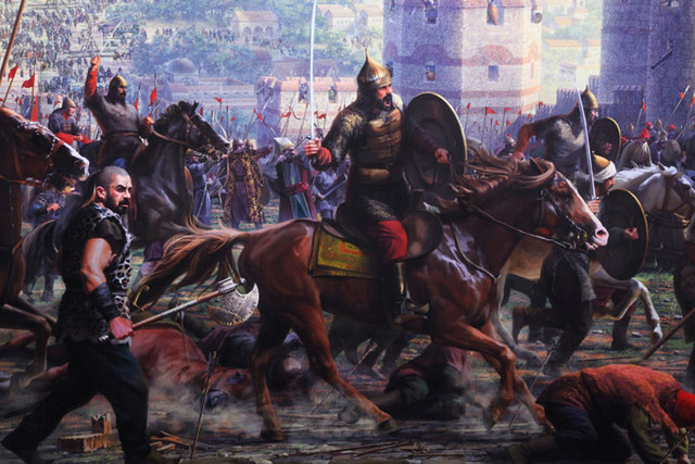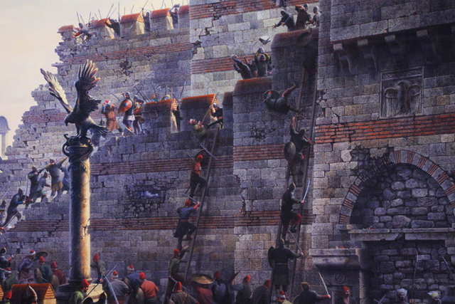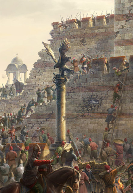 29 MayısGün doğmadan üç saat önce bütün Osmanlı ordusu karadan ve denizden, tekbir, davul ve nakkare seslerinin sağır edici gürültüsü içinde bütün cephelerde büyük hücuma başladı. Müdafiler savaş konumu alırken, şehirde halk kiliselerde dua ediyordu. Güneş doğarken arka arkaya üçüncü saldırıyı gerçekleştiren Osmanlı askerleri, top ateşi ve lağım patlaması sonucu Topkapı-Edirnekapı arasındaki yıkılan surlardan şehre girdiler. Bizans'ın savunması çöktü ve her yerden İstanbul'a giren Türk askerleri şehri tamamen ele geçirdiler. Sultan II. Mehmed şehre tamamen hakim olunduğu bilgisi kendine ulaşınca İstanbul'a girdi. Ayasofya'da ezan okutup, askerleriyle namaz kıldı. Sonra Ayasofya kubbesine çıkıp İstanbul'u seyretti.