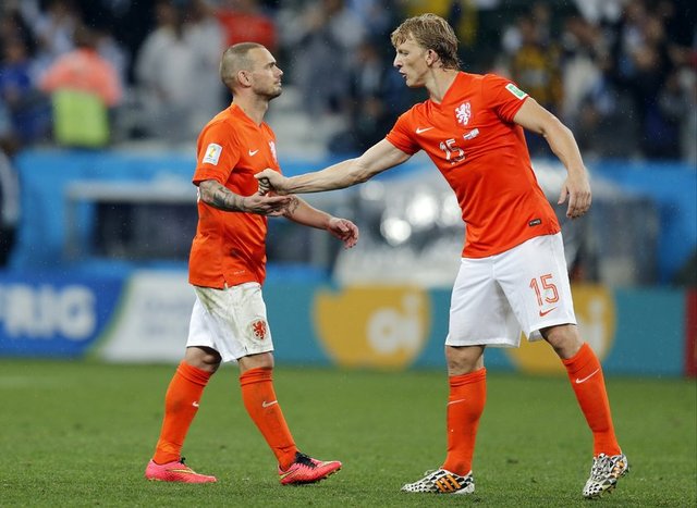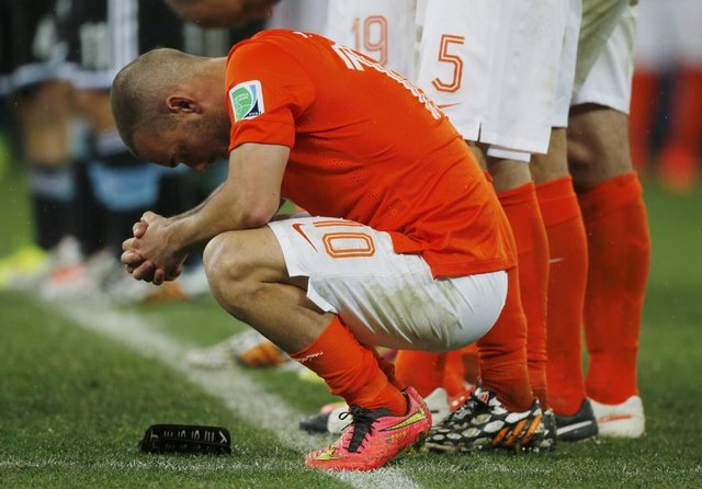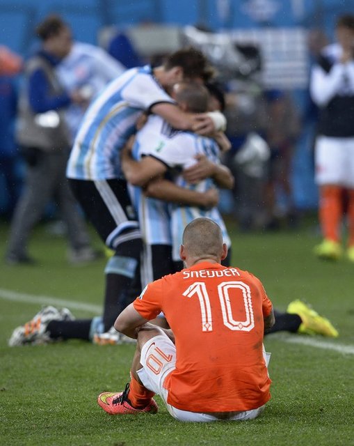 Arjantin karşısında seri penaltılarda kaleciye takılan Galatasaraylı Sneijder'i ilk teselli eden Fenerbahçeli Kuyt oldu
