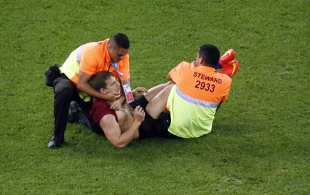 Oyuncular sahaya giren taraftarı şaşkınlıkla izlerken güvenlik görevlilerinin taraftarı sert bir şekilde yaka paça dışarı çıkarması dikkatlerden kaçmadı.