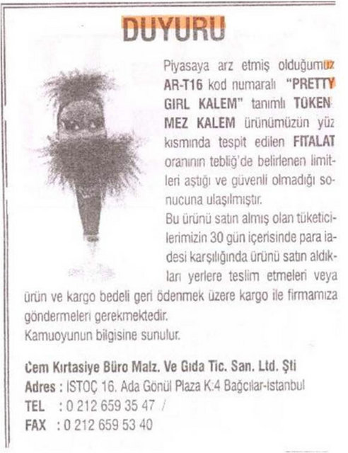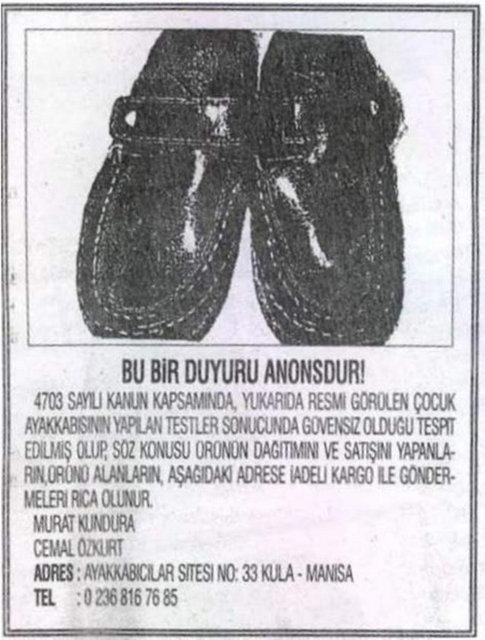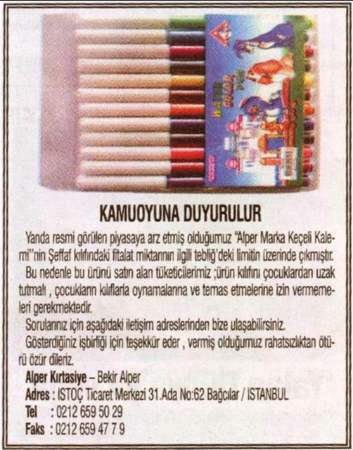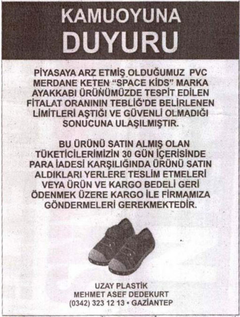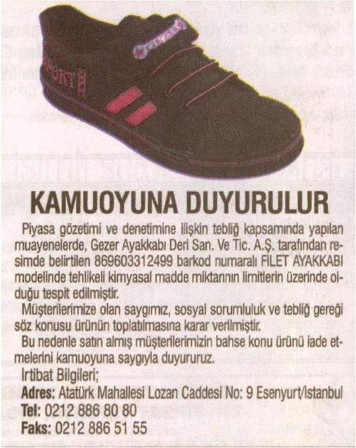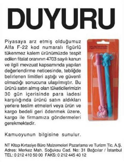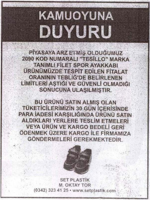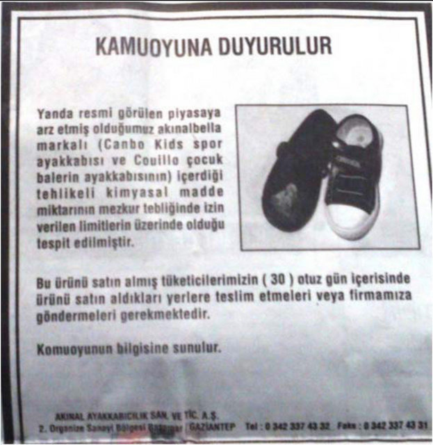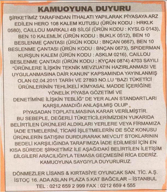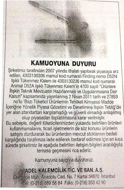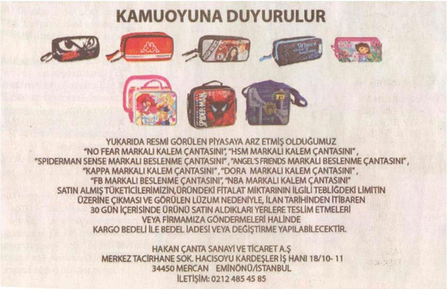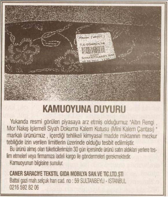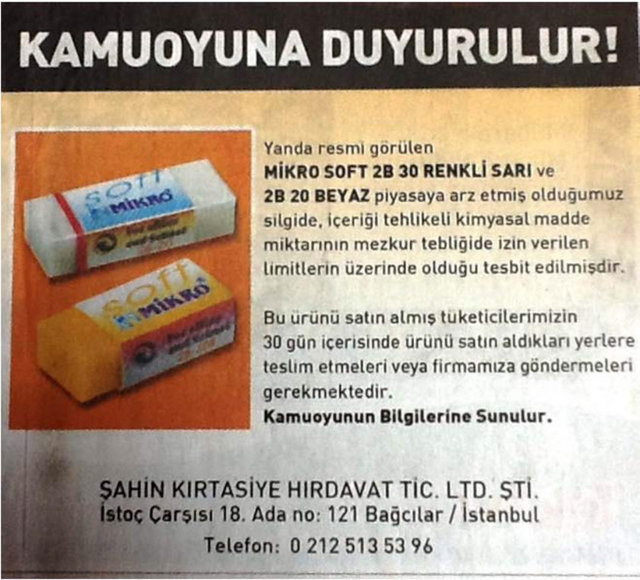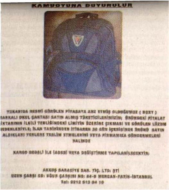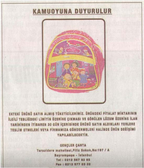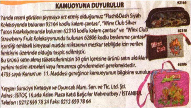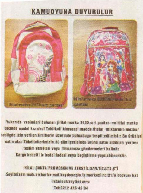 Gümrük ve Ticaret Bakanlığı Tüketicinin Korunması ve Piyasa Gözetimi Genel Müdürlüğü, 22 firmanın sattığı okul çantası, ayakkabı ve kalem gibi ürünlerde, sağlığa zararlı kimyasal madde miktarının limitlerin üzerinde olduğunu belirledi.