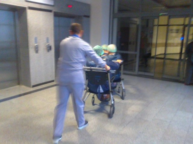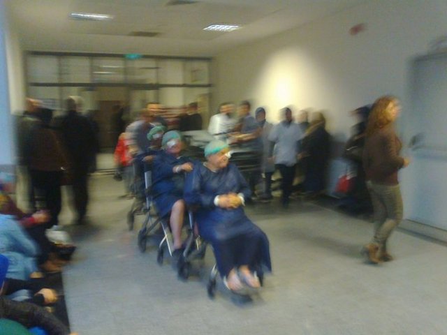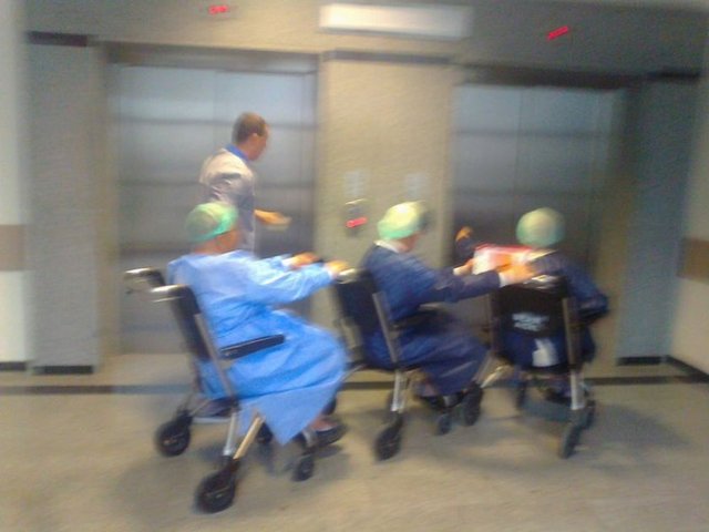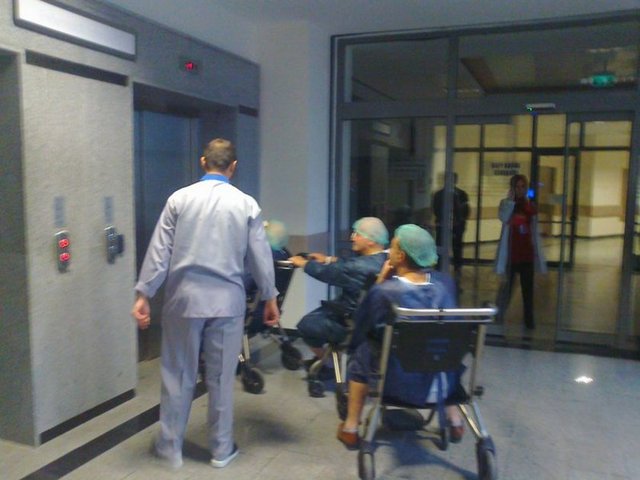 Adapazarı'nda 2 yıl önce hizmete giren 400 yataklı Sakarya Eğitim ve Araştırma Hastanesi'nde çocukların 'Trencilik oyunundaki' gibi peş peşe sıralanan 3 hasta tekerlekli sandalye ile arka arkaya birbirlerine tutunarak ameliyathane asansörüne götürülürken görüntülendi