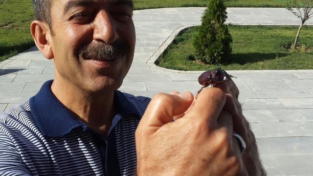 Bu kez de Erzurum'da bulunduSon günlerde türüne Türkiye'de çok rastlanan gergedan böceğini bulan Hasan Köseoğlu, bilimsel olarak böceği incelemek isteyen uzmanlara seslendi. (İHA)