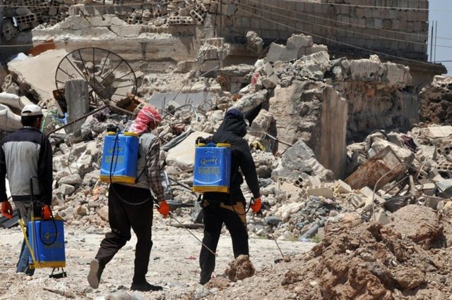 Kentte ilaçlama yapılırken, çocuklar enkazların arasında oyun oynayıp bisiklete binerek eğlenmeye çalışıyor.