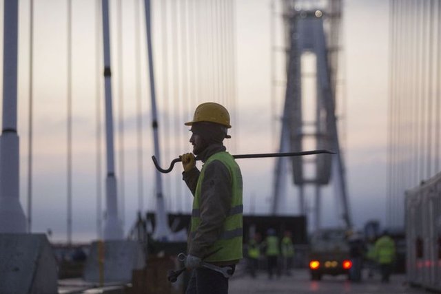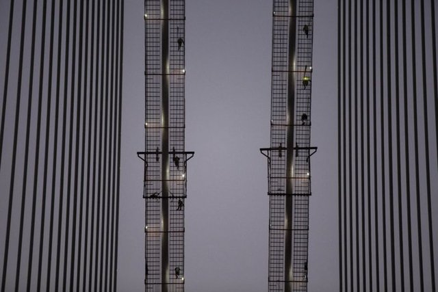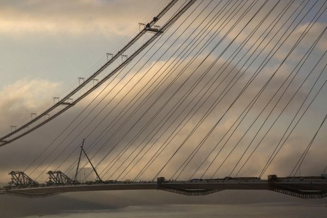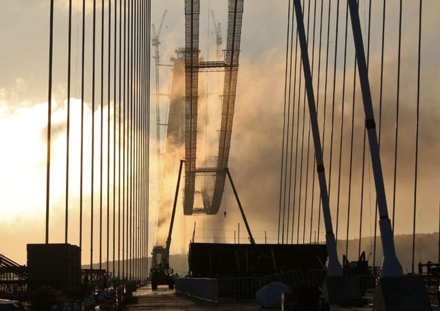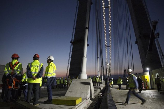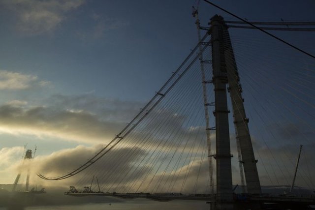 Çapraz halatlarla köprü kulelerine direkt bağlı tabliyelerin montajı tamamlanırken iki yaka da birbirine oldukça yaklaştı.