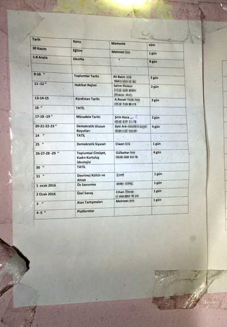 Duvardaki ders programında ise "özel savaş", "öz savunma", "alan tartışmaları", "demokratik ulusun boyutları" ve "mücadele tarihi" dersleri verildiği görülüyor. -