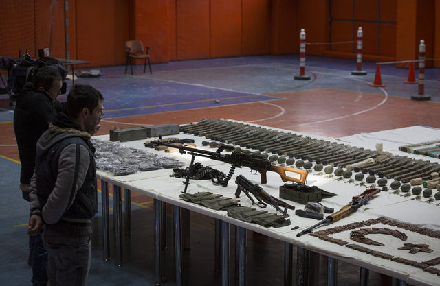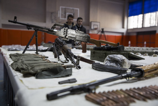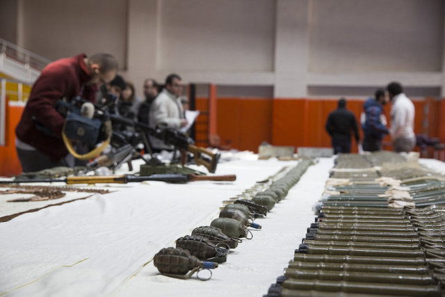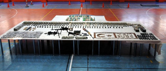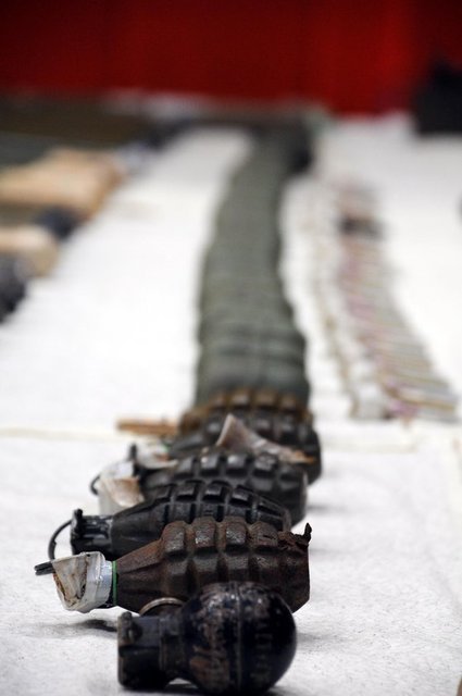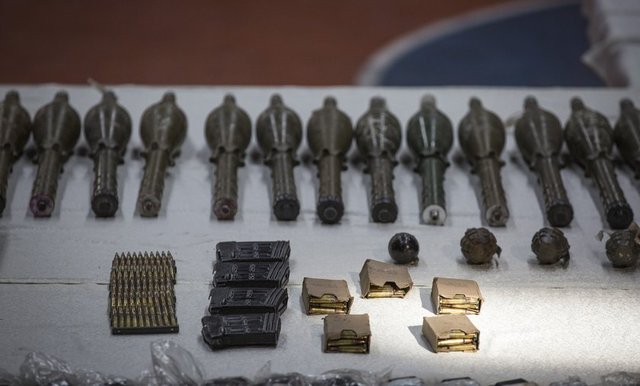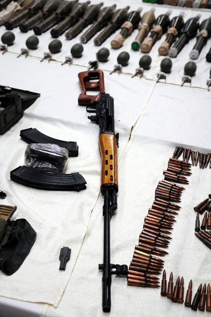 22 el bombasına ait fünye, 82 şarjör, bin 860 fişek, 2 metal kutu içerisinde uzun namlulu tüfek fişeği, keskin nişancı tüfeğine ait dürbün, 4 keskin nişancı tüfeği şarjörü ve çok sayıda uzun namlulu fişek mayonu bulundu. (AA)