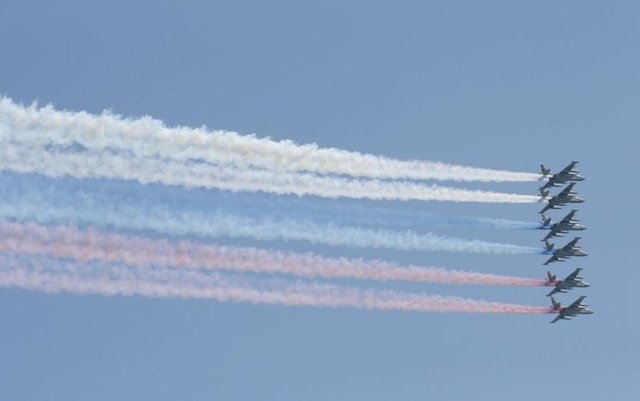 Törene yaklaşık 10 bin asker, 135 zırhlı askeri araç, çeşitli füze sistemleri, 71 helikopter ve uçak katıldı.