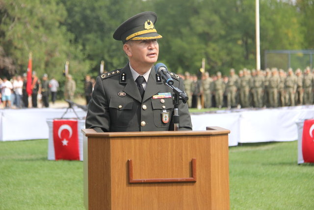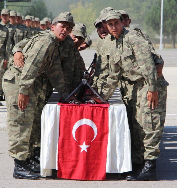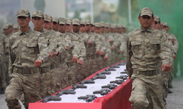 Daha sonra Türk Bayrağı'nın üzerine konulan silahların bulunduğu masaların başına geçen askerler, komutanlarının sözlerini tekrarlayarak yemin etti. Yemin sonrası birliğe ilk teslim olan er Erdoğan Yılmaz, yaş kütüğüne plaket çaktı.