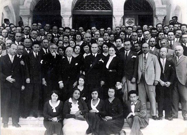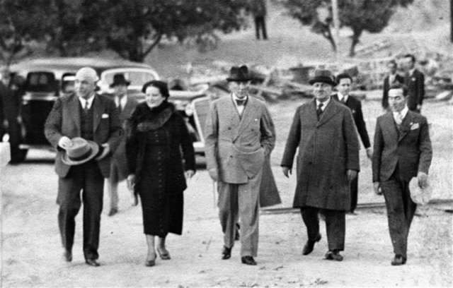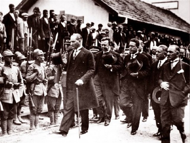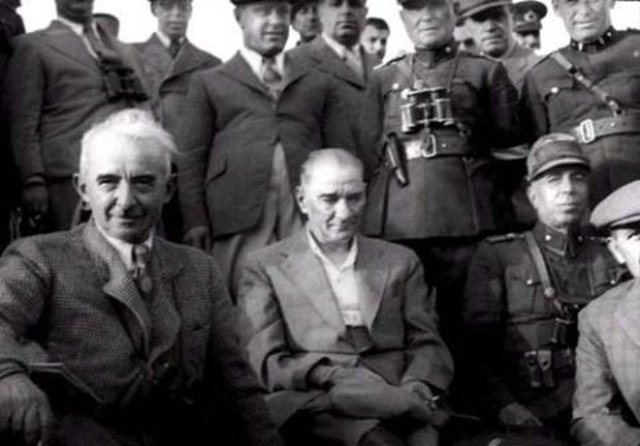 Atatürk, 1922 yılında İstanbullu gazetecilerle Ankara'nın Karaçam köyünde görülüyor. -