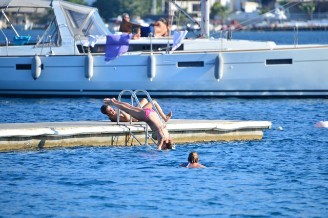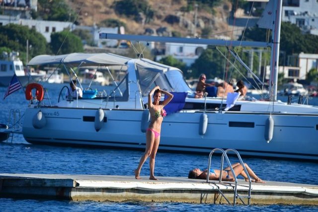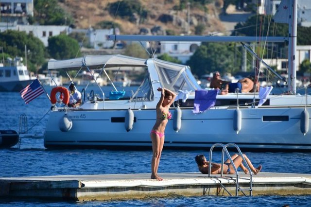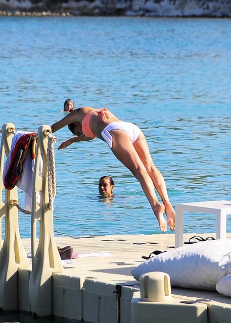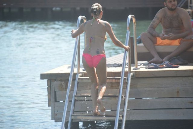 Turuncu bikinisinin üzerine giydiği beyaz gömleğiyle ilginç bir görüntü oluşturan Özerk, şaşkın bakışların odağı oldu. - -