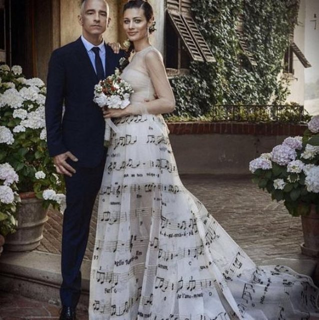 İtalya'nın Monterotondo'da gerçekleşen törende, manken Pellegrinelli, üzerinde sevdikleri aşk şarkısının notaları yazılı olan krem rengi bir gelinlik giydi.