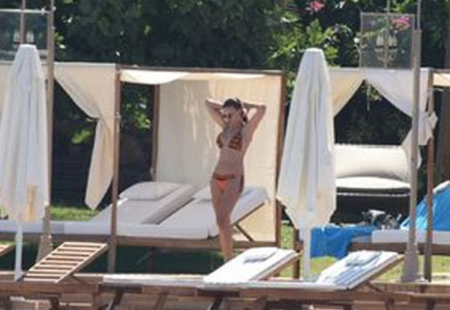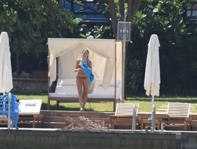Sabah pembe, öğlen turuncu bikinisiyle görüntülenen oyuncu, denizden çıktığı sırada gazetecileri fark edince panikledi.